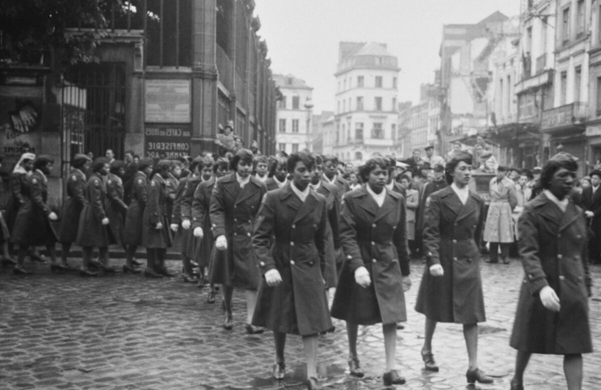 Military personnel of the 6888th Central Postal Directory Battalion take part in a parade in