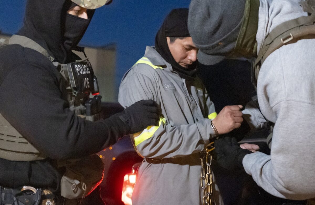 U.S. Immigration and Customs Enforcement officers use a chain to more comfortably restrain a detained