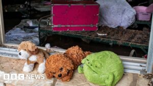 Destroyed personal belongings are scattered across soaked interiors where children once gathered for Bible study and campfire songs.