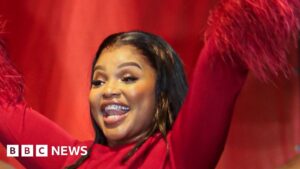 SIYABONGA SOKHELA / GALLO IMAGES / GETTY IMAGES A woman dressed in red stands on stand with her arms in the air.SIYABONGA SOKHELA / GALLO IMAGES / GETTY IMAGES