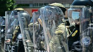 Members of the California National Guard and US Customs and Border Protection agents stand behind shields outside the Federal Building in Los Angeles, on June 10, 2025.