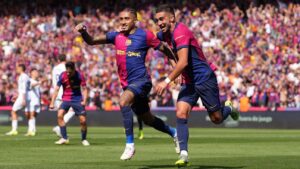 Kylian Mbappé put Madrid ahead from the penalty spot in the fifth minute and doubled the visitors’ lead shortly after to give Madrid hope of blowing the title race wide open at Montjuïc. But their joy was short-lived, as Eric García’s header reduced the deficit, Lamine Yamal’s curling shot made it 2-2 and Raphinha scored twice to see Barça go 4-2 up at halftime.