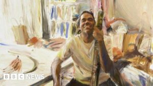 Her winning work is a portrait of Aboriginal Australian musician William Barton, which she painted with her fingers as a nerve injury made painting difficult for her.