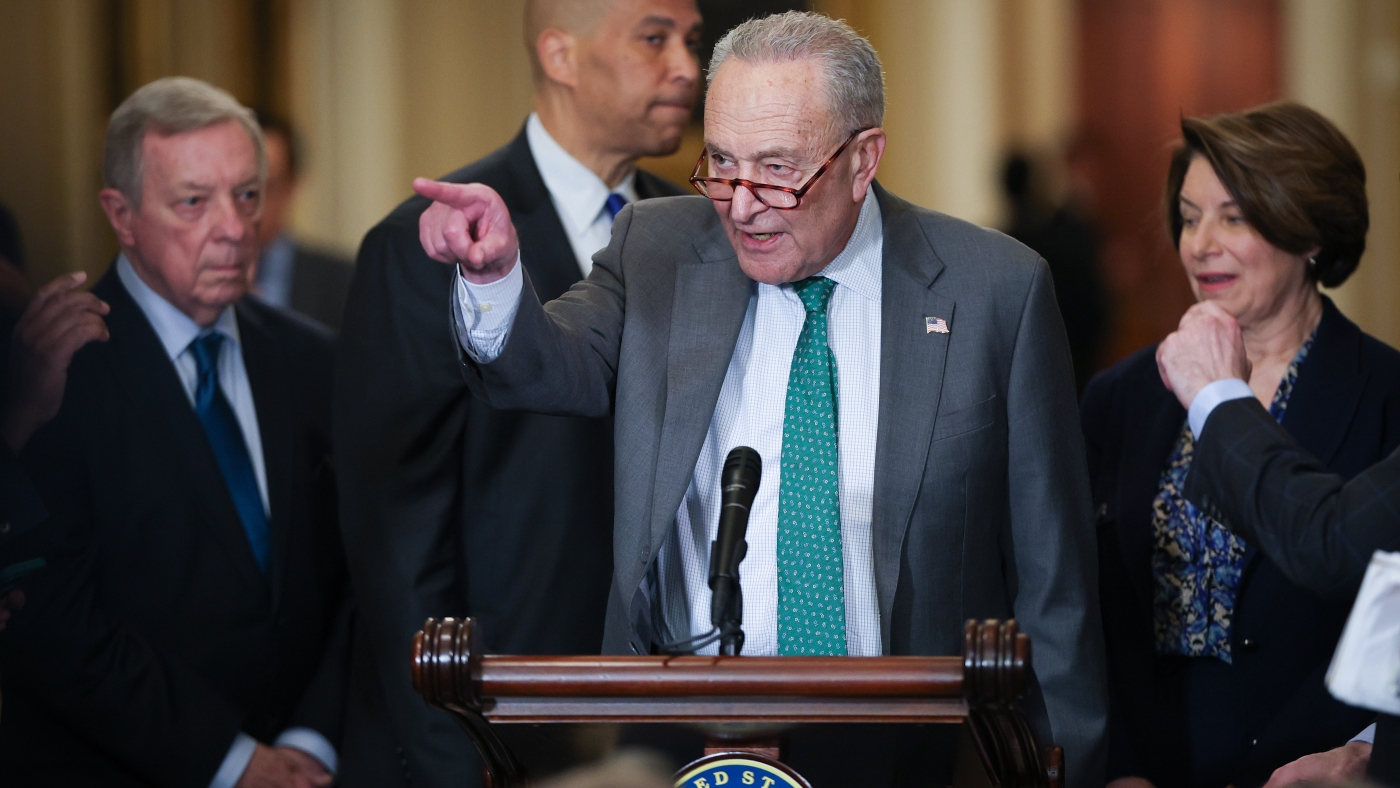 WASHINGTON, DC – MARCH 11: Senate Minority Leader Chuck Schumer (D-NY) speaks during a press conference following a policy luncheon at the U.S. Capitol on March 11, 2025 in Washington, DC. Schumer answered a range of questions during the press conference. (Photo by Win McNamee/Getty Images)