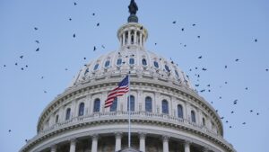 Birds fly around the U.S. Capitol Dome at sunrise in September 2024 in Washington, D.C.