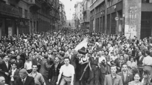 Civilians fill the streets of Milan, Italy, on April 25, 1945, to celebrate their liberation by Italian partisans from German Nazi forces and the fascist regime. Many believe the famous Italian anti-fascist anthem “Bella Ciao” to be associated with World War II, but the song gained widespread popularity only a few years after World War II.