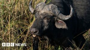 An official at Namibia’s Kabulabula Conservancy told the BBC the herd of buffaloes was fleeing lions in Chobe National Park.