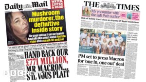 “Hand back out £771 million, Mr Macron … s’il vous plait,” says the Daily Mail ahead of the French president’s visit. The paper says Macron will “face questions over his country’s failure to make a dent in illegal Channel crossings – despite being handed more than three quarters of a billion pounds of British taxpayers money”. Also splashed across the front page is the face of Erin Patterson, the Australian woman who was found guilty of murdering three relatives and attempting to kill another by serving wild mushrooms at a lunch.