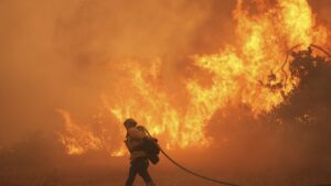 A firefighter battles the Canyon Fire in August in Hasley Canyon, Calif. As temperatures rise with human-caused climate change, wildfire risk is getting worse.