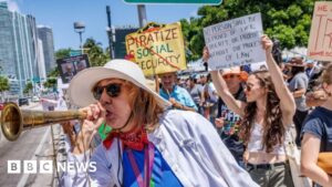 ReutersSaturday’s protests addressed a number of Trump actions, including those by the the Department of Government Efficiency (Doge) – Trump’s initiative to cut US government jobs and other spending – and the administration’s unwillingness to bring about the return of Ábrego García, a citizen of El Salvador.