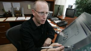 Scott Adams, creator of Dilbert, the office humor comic strip, is pictured at work in 2006. Adams has metastatic prostate cancer and he appealed to President Trump to help save his life by solving a bureaucratic problem with his health insurance. It worked: His appointment is Tuesday.