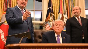President Trump, center, and Secretary of Commerce Howard Lutnick, right, listen as U.S. Sen Ted Cruz, R-Tex. speaks during a signing ceremony for an executive order on AI at the White House on Dec. 11, 2025.